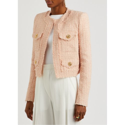 Balmain’s rich couture history is celebrated throughout Olivier Rousteing’s collections, and gold medallions play a key part. Adorned with the house’s signature ornate buttons at the cuffs and pockets, this bouclé tweed jacket is tailored to a collarless silhouette with structured shoulders and a cropped hem.