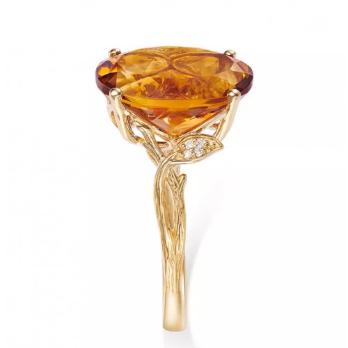 A unique oval-cut red citrine is accented with diamonds in a dramatic statement ring