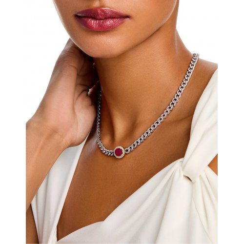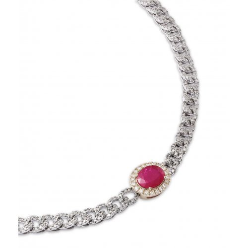 Boundless elegance radiates from this stunning choker/collar necklace, designed with a center oval-cut ruby, set in a halo on a dazzling diamond chain